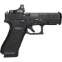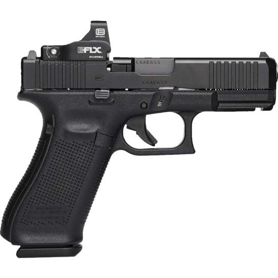 The Glock 45 Gen5 MOS Crossover combines a compact slide with a full size frame. Gen5 features flared mag-well has a larger funnel; Glock Marksman Barrel (GMB) more aggressive polygonal rifling with a target-style crown and tighter chamber specs; ambidextrous slide stop levers offer increased ergonomics for left-hand shooters and shooting with the support hand; removal of finger grooves; Safe Action System, safeties disengage sequentially as the trigger is pulled and automatically re-engage when the trigger is released; enlarged floor plate makes it easier to pull the magazine free of the pistol and customizable frame size with backstraps in two sizes with beavertail. The multiple backstrap frame allows the users to change the circumference of the grip to fit their individual hand size. MOS features a slide that is precision machined to provide a mounting system for popular optic sights. With multiple adapter plates (sold separately), you can quickly and easily mount miniature red dot sights. Includes EoTech 3 MOA Mini Reflex sight, one adapter plate, three magazines, mag loader, cleaning kit, pistol case and gun lock.
